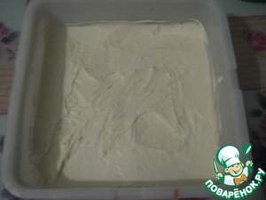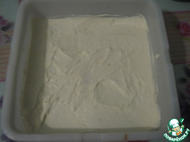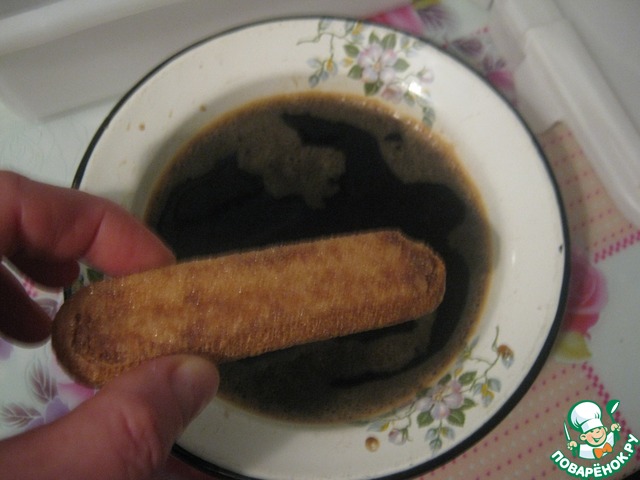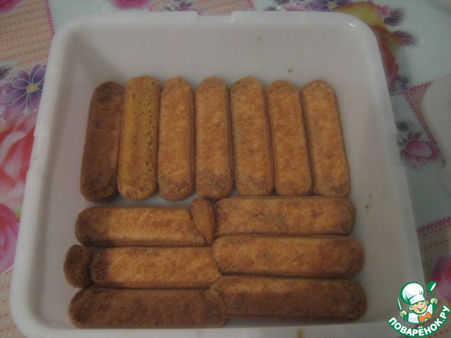 Теперь начинаем собирать наш тортик "Тирамису". Для этого я использую форму с крышкой, размер формы 22 см Х 22 см X 7 cм. Я не люблю сильно промоченное печенье, поэтому опускаю его в кофе по 1 секунде каждую сторону, не выпуская из рук. Укладываю смоченное печенье рядами как на фото.