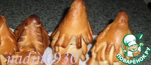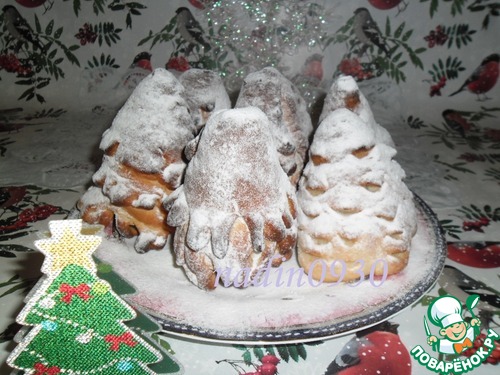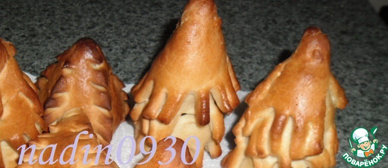 Готовое тесто разделить на кусочки, подкатать их в колбаски. Подпылить стол, раскатать колбаски в полоски, с одной стороны сделать разрезы "бахромой", накрутить на промасленные конусы, края смазать яйцом взбитым с молоком, закрепить. Я сделала елки с бахромой и кружочками, надрезанными в виде веток, как в предыдущем рецепте Булочка "Ёлочка закусочная" (ссылка внизу)