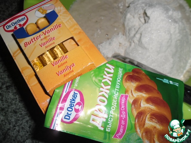 В теплой воде растворить дрожжи (у меня универсальные от «Dr. Oetker»). Когда они поднимутся крепкой шапочкой, замесить тесто из продуктов комнатной температуры. От молока отлить 2 ст. л для зефирного крема, остальное нагреть, растворить в нём сахар и соль, влить в дрожжи, добавить ванильный ароматизатор от Dr. Oetker 2 мл, как раз одну пробирку.