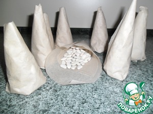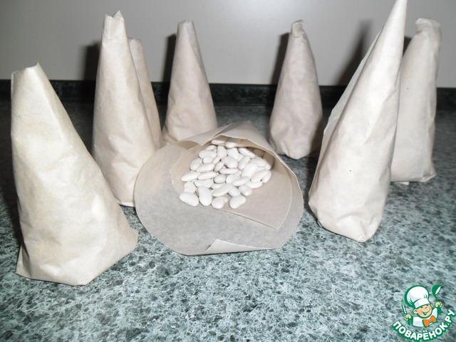 А сами займемся приготовлением форм для ёлок. В предыдущем рецепте я уже показывала этот процесс, повторюсь. Из пергамента скручиваем конусы или кульки, внутрь насыпаем фасоль любого сорта, закрепляем дно, немного "трамбуем" на столе для устойчивости формы.