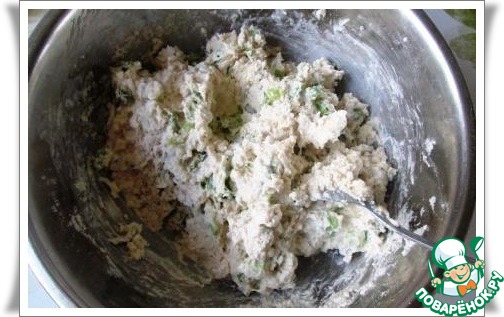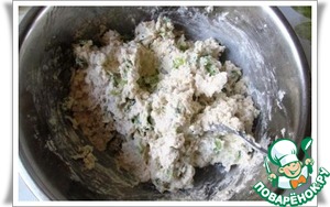 Добавляем кусочки мягкого сливочного масла и растираем пальцами до получения жирной крошки. Можно это проделать и миксером. Вливаем кефир и перемешиваем -