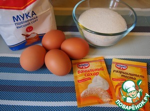Аккуратно добавляем желтки к белкам, мешая массу снизу вверх. Всыпаем просеянную муку с разрыхлителем и крахмалом. Добавляем ванильный сахар. Мешаем тесто аккуратно, чтобы оно не потеряло воздушности.