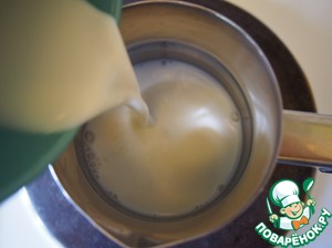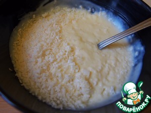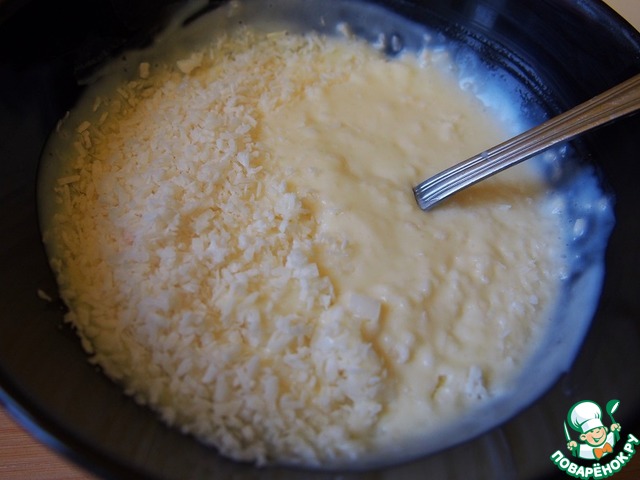Теперь приготовим кокосовый крем. К части молока добавляем крахмал и просеянную муку, перемешиваем. Оставшееся молоко доводим до кипения и вливаем в него полученную смесь. Варим до загустения, постоянно помешивая. Охлаждаем.