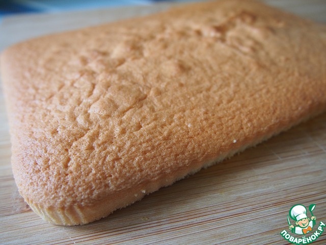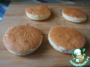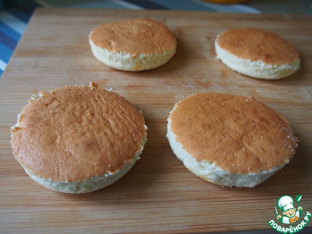 Из остывшего бисквита вырезаем одинаковые кружочки. У меня из этого количества теста получилось 10 кружков диаметром 7 см.