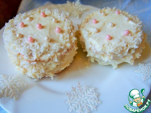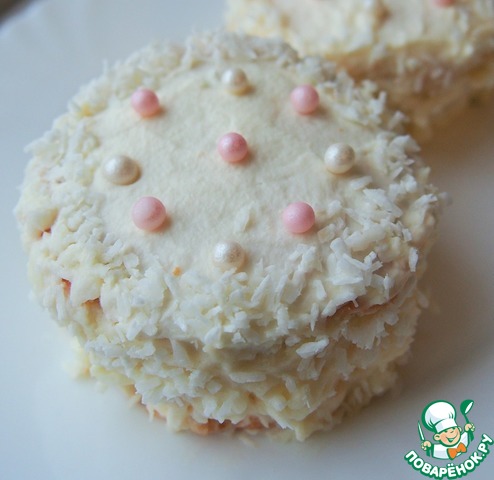 Сверху я обмазала пирожные взбитыми сливками и украсила кокосовой стружкой и жемчужной посыпкой.