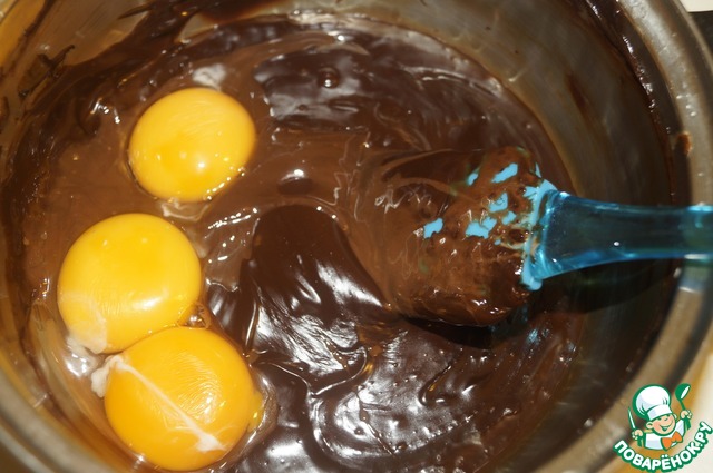 Добавить в шоколадную массу желтки и взбить венчиком.