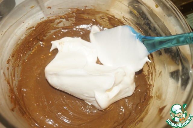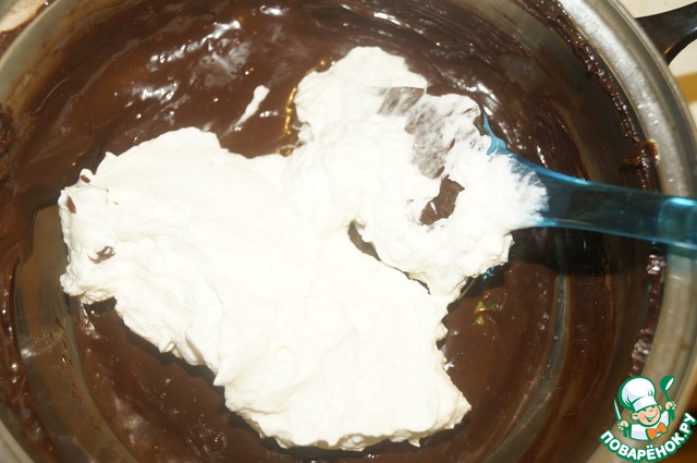 Добавить постепенно взбитые белки в шоколадно-сливочную массу. Аккуратно перемешать.