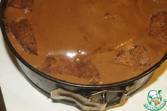 Распределить оставшийся шоколадный мусс. Маленький корж Захер разделить на небольшие кусочки и утопить их в шоколадном муссе. Убрать торт в холодильник для застывания на ночь или на 8-10 часов.