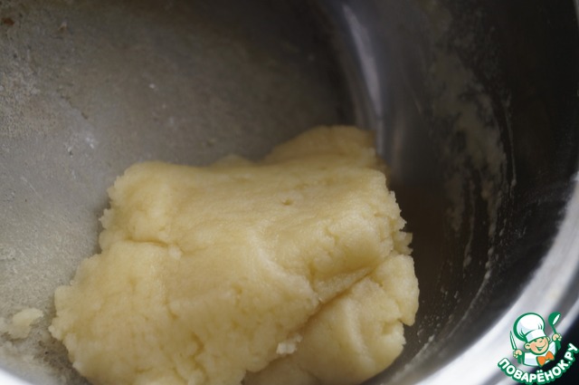 Сначала нужно приготовить заварное тесто. Для этого в кастрюлю налить воду, добавить сливочное масло, щепотку соли и довести до кипения. Всыпать разом всю муку и быстро размешать. В результате тесто должно собраться в ком. Держать тесто на плите еще пару минут на медленном огне, периодически помешивая.