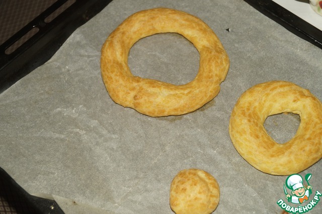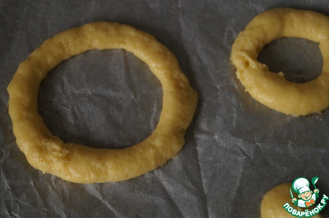 Переложить тесто в кондитерский мешок с круглым наконечником. На пергамент отсадить заготовки: 2 круга - один маленький, другой большой. Из остатков теста отсадить эклеры (выйдет 1-2, не больше).