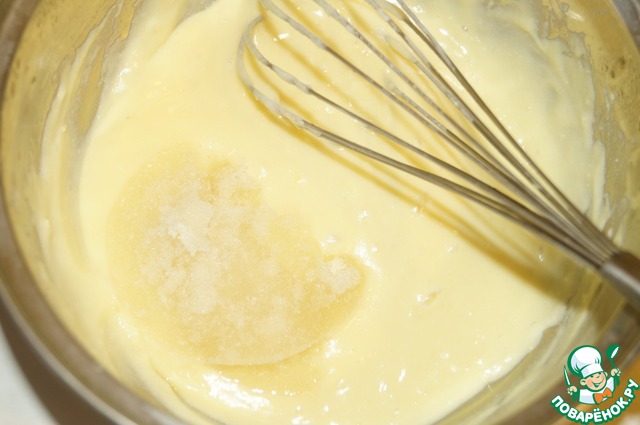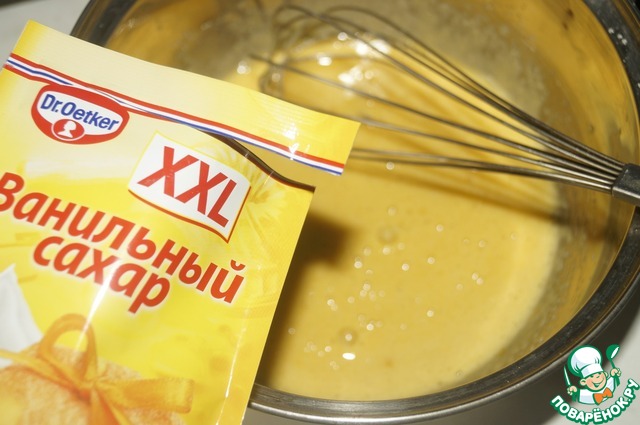 Желтки взбить с сахаром и ванильным сахаром. Подогреть молоко. Влить тонкой стрункой почти все молоко, оставив примерно 50 мл. В оставшееся молоко добавить муку и перемешать до однородной массы.