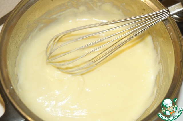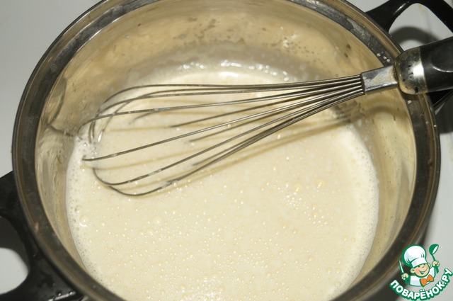 Подогреть молоко. Влить тонкой стрункой почти все молоко во взбитые яичные желтки, оставив примерно 50 мл. В оставшееся молоко добавить муку и перемешать до однородной массы. Поставить массу на огонь.