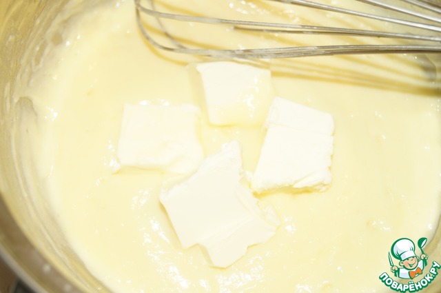 Добавить размягченное сливочное масло и перемешать крем до однородности. Накрыть крем пленкой в контакт и убрать минут на 20 в холодильник для легкого загустения.