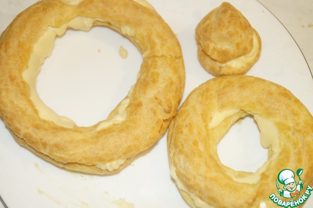 Переложить крем в кондитерский мешок. Разрезать заварные заготовки пополам. На нижнюю часть нанести крем и накрыть верхней. Убрать в холодильник.