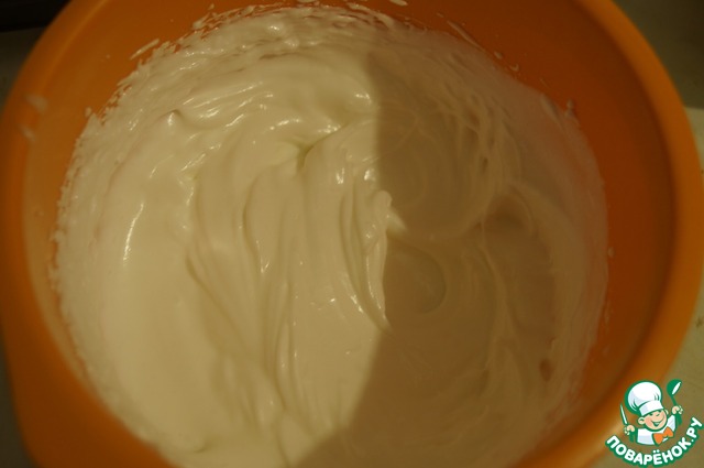300 мл охлажденных сливок взбить в пышную массу. Если они плохо взбиваются, то здесь отличной палочкой выручалочкой будет загуститель для сливок. Добавить загуститель и взбить в течении пары 1-2 минут.