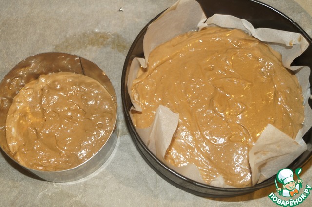 Переложить массу в форму для выпечки. Я приготовила 2 коржа: один основной и один небольшой. Выпекать при температуре 160 градусов около 15 минут. Затем прибавить нагрев до 200 градусов и выпекать около 7-10 минут. Готовые коржи аккуратно освободить от форм и остудить.