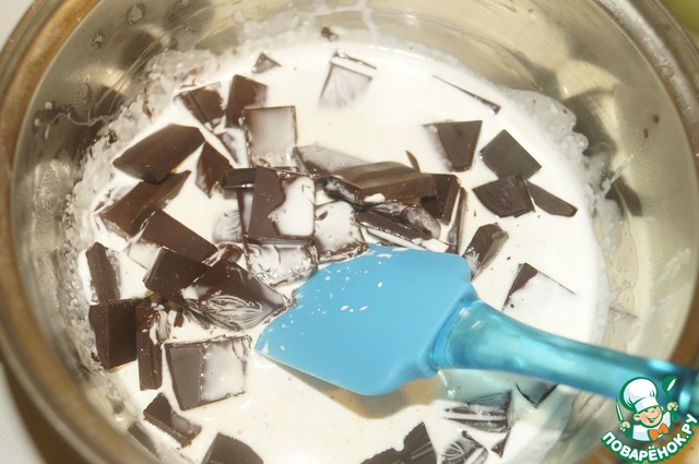 150 мл сливок нагреть до кипения и снять с огня. Добавить поломанный шоколад. Мешать массу лопаткой до полного растворения шоколада. Добавить растопленный желатин. Хорошо перемешать.