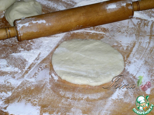 Шарик теста раскатала размером с блюдце не тонко, около 0,7см толщиной. -