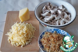 Лук нарезать полукольцами, шампиньоны - тонкими пластинками. Сыр натереть на крупной терке (у меня было 50 г гауды и 50 г пармезана).