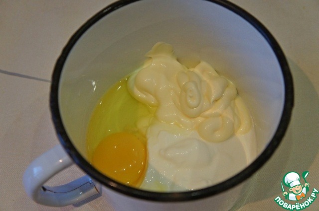 Взбить сметану, майонез и яйцо. Посолить и поперчить по вкусу. Добавить измельченный чеснок и перемешать.