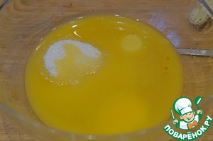 Масло растопить, слегка остудить, добавить сахар и яйца и все взбить.