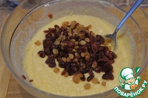 У меня дома оказалось мало изюма и я добавила вяленой клюквы. Изюм промыть и залить горячей водой на 5 минут. Затем откинуть на дуршлаг. -