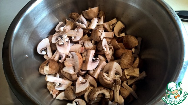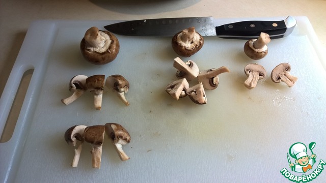 • Грибы промываем, нарезаем крупными ломтиками - вдоль ножки. Маленькие грибы разрезаем пополам, средние - на 4 части. Большие - на 6.