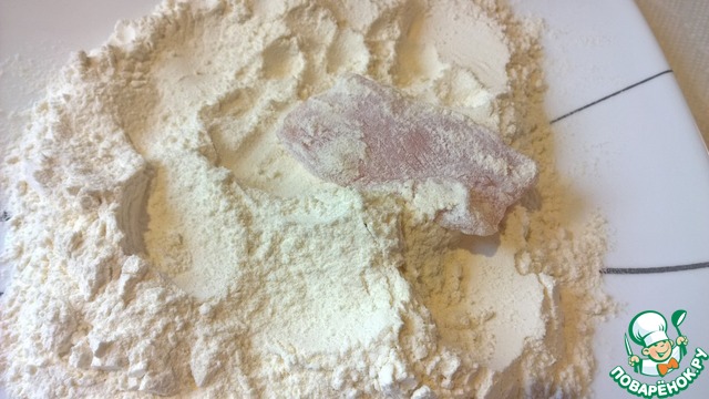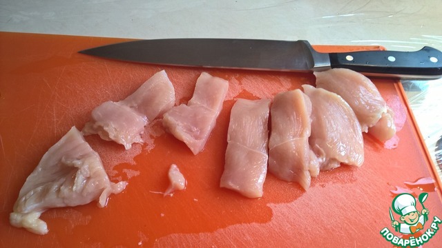 • Куриные грудки разрезаем на крупные куски. Отрезаем тонкий кончик, затем каждый кусок разрезаем вдоль, параллельно столу (чтобы он стал тоньше) и затем еще поперек на 3 части.