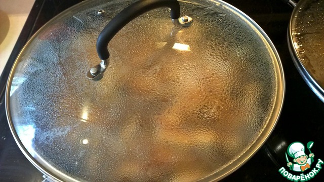 • Солим, накрываем крышками сковороды, доводим до кипения и уменьшаем огонь до самого малого. Тушим под крышками около 30 минут