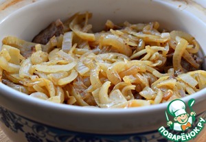 Соус снять с огня, процедить, залить соусом мясо с луком. -