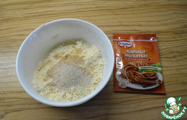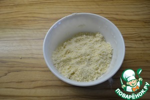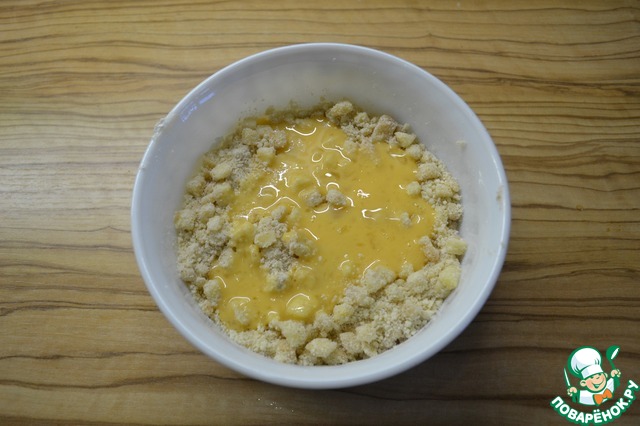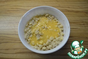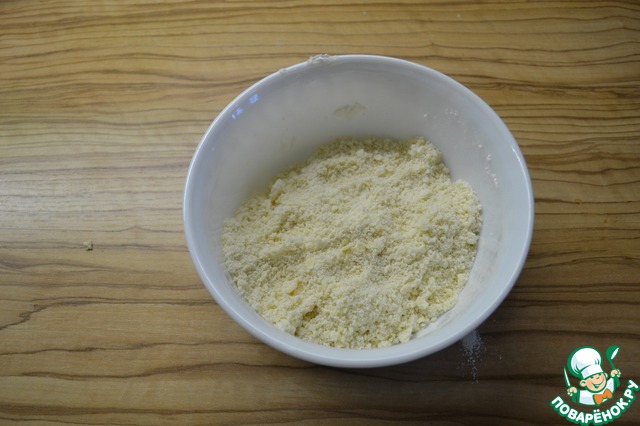 Добавить оставшееся сливочное масло. И разтереть с мукой до образования крошки.