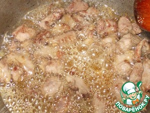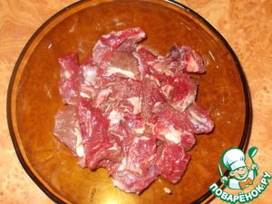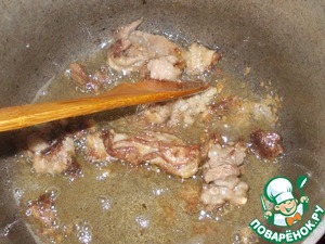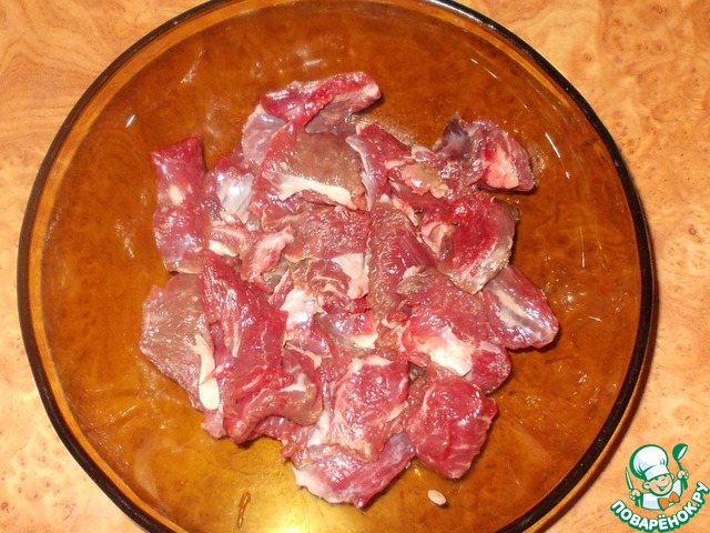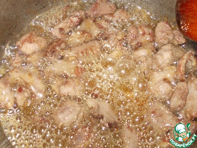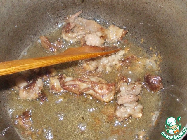 Пока жир вытапливается, подготавливаем мясо. Стоит убрать плеву и пленки, нарезаем не сильно крупными кусочками.