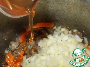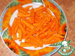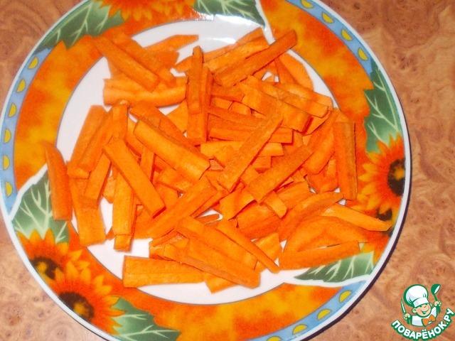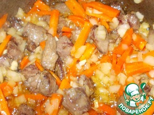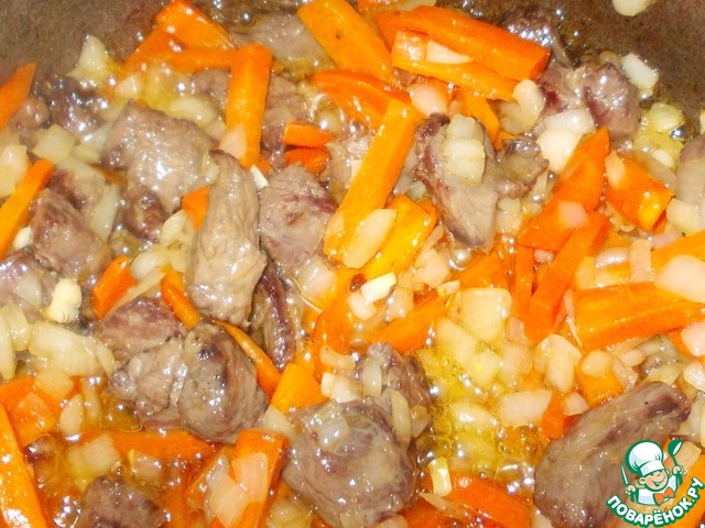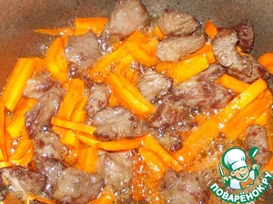 Когда мясо обжарилось, выкладываем к нему морковь. И обжариваем еще 2-3 минуты.