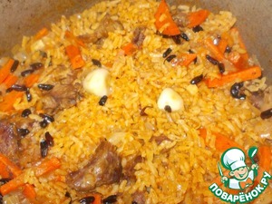 Через 30 минут в плов опускаем два очищенных и наколотых зубочисткой зубочка чеснока. Закрываем крышку. -
