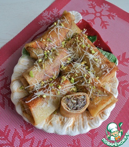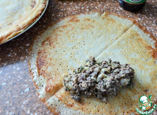 На нашем праздничном столе всегда фаршированные блинчики, чаще с мясной начинкой. Вот еще один из вариантов начинки - из говяжьего легкого и бараньих почек. Не фыркайте, почки - вкусный продукт, просто надо уметь их готовить. Угощайтесь.