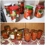 1. Почистить болгарские перцы, помыть помидоры, помидорки наколоть зубочисткой около плодоножки (чтобы не полопались), уложить все в банки (зелень, чеснок, помидоры, перцы полосками).