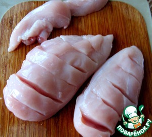 Грудку промыть, зачистить, срезать маленькие кусочки, которые так и просятся стать отделенными!) Делаем ножом надрезы для лучшей дальнейшей маринации! Оставляем мясо пока погрустить и переходим к приготовлению маринада!
