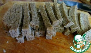 Пока будет запекаться наша грудка мы сделаем гренки! Два ломтика хлеба нарезаем любыми удобными для вас кусочками! При этом корочку необходимо отрезать, ее мы использовать не будем! Подсушиваем любым удобным вам способом! Я делаю в микроволновой печи, у меня занимает это около 4 минут на мощности 800, постоянно перемешивая и давая остыть. Т. е. на минутку включили, дали остыть, перемешали.