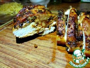 Ну и конечно же возвращаемся к нашей грудке! Мясо надо хорошо промазать маринадом! Мы не будем ждать пока она маринуется, она и без этого получится очень вкусная для салата. Как самостоятельное блюдо она конечно получается довольно специфическая! Ставим в духовку (верх-низ) 180гр. оставляем запекаться на 40 минут (плюс-минус), зависит от духовки.