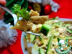 Далее все еще проще надо все выложить в глубокую тарелку и смешать, а при подаче посыпать гренками.