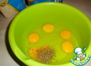 Тем временем, в миску разбить 5 яиц, добавить соль и прованские травы. Взбить венчиком.