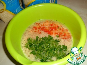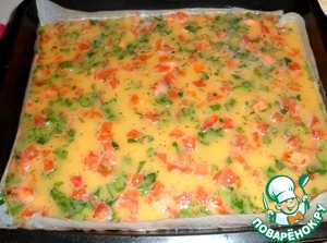 Противень застелить пергаментом, смазать его маслом и вылить омлет. Поставить в горячую духовку 200°C на 10-15 минут. Не передержать