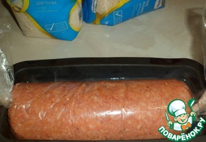 Соединить фарш над омлетом при помощи пленки, хорошо прижимая, затем пленку отвернуть, если выглядывает омлет -поправить и смазать кисточкой маслом. Плотно завернуть в пленку, в несколько слоев. Выкладываем в прямоугольную форму, налив в нее до половины воды. В процессе -рулет перевернуть. Ставим в горячую духовку 180°C на 30-35 минут. Вынуть из воды, дать остыть в пленке, затем отправить в холодильник.