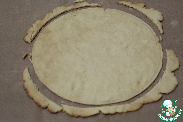 Я выкладывала кусок теста на пленку и пальцами разминала в круг, а потом прикрывала пергаментом и докатывала скалкой, потом переворачивалапленкой вверх, снимала пленку и выпекала на пергаменте.