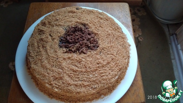 Присыпаем середину шоколадной стружкой - небольшой круг, остальную часть коржа присыпаем крошкой. -