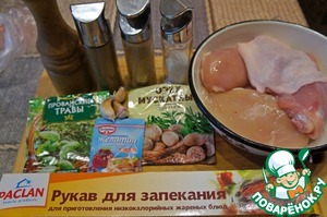 Ветчина получается вкуснее и сочнее, если делать её не из одной грудки, поэтому я взяла я взяла 2 филе и 3 бедра. Нам потребуются так же итальянские или прованские травы, в списке ингредиентов их, к сожалению, нет.