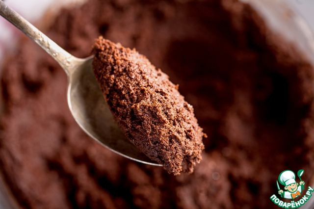 Добавить муку, разрыхлитель и какао. Вымешать миксером или ложкой. Смотреть на консистенцию теста: оно должно хорошо скатываться в шарики, которые в идеале не рассыпаются при надавливании. Если тесто слишком рассыпчатое, добавить 2-3 столовые ложки жидкости - воды, молока, сливок, кофе. Жидкость добавлять по ложечке и после каждой вымешивать тесто, чтоб не переборщить. Я обычно добавляю в качестве жидкости (или вместе с ней) какой-то ароматный алкоголь - пару ложечек шоколадного ликера или смесь воды с коньяком. Но это на ваш вкус.