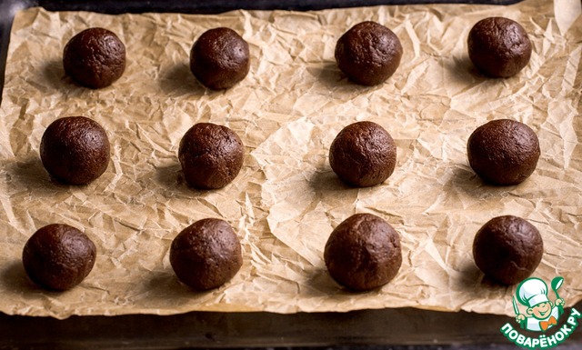 Противень застилаем пергаментом для выпечки и выкладываем шарики. Оставляем между ними расстояние 4-5 сантиметров. На один стандартный противень помещается 12 печенек.