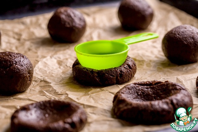 Приплющиваем каждый шарик по центру любым подходящим предметом, формируя углубление. Мне нравится использовать для этого столовую мерную ложку - так получается большая круглая выемка. Если печеньки трескаются, их можно поправить пальцами. Если сильно трескаются - добавить в тесто немного жидкости. Мне, наоборот, трещинки нравятся - придают печенью фактурности и домашнего уюта.