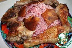Выкладываем на блюдо рис, разломанный казмах и курицу.